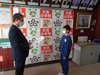 さて、そんななかで9日(火)の朝にリモートで表彰朝会を行いました。体育館関係や理科関係、図工関係などで子どもたちのがんばりのおかげで、たくさんの賞状が届いていました。どの子もしっかりと返事をして賞状等を受け取っていました。同じ日に「まごころ訪問」の引渡し式を実施しました。大寄地区にお住いの一人暮らしのお年寄りに、民生委員さんたちが鉢花とお手紙を届けてくださいます。本校では4年生が花の世話と手紙を書き、この日引き渡しました。
