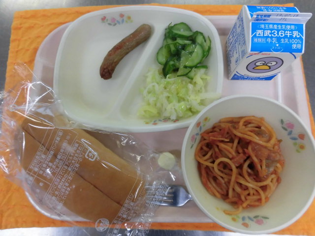 ★牛乳・コッペパンスライス・焼きフランク・キャベツときゅうりのドレッシング和え・スパゲティナポリタン★