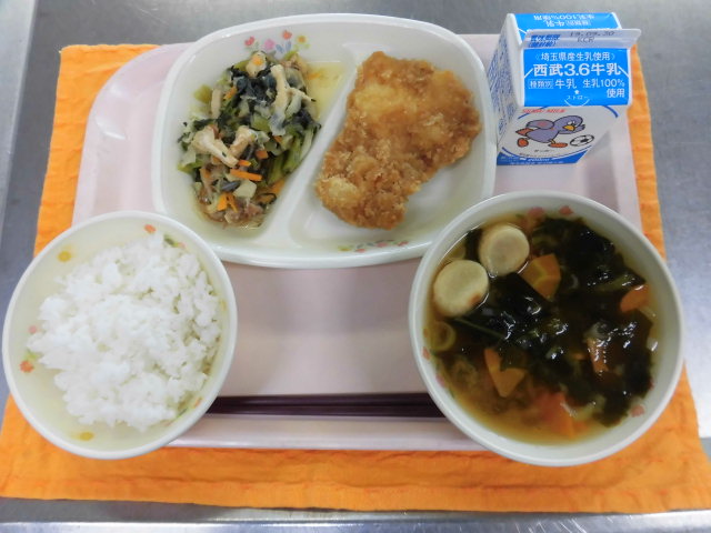 勝負に勝つという事でカツ丼です。カラッと揚がった鶏ムネ肉のカツに甘い醤油ダレをかけています。1年生からは「明日は絶対勝つよ」と頼もしい声が上がっていました。小松菜やキャベツ、人参などが入った煮びたしも優しい味でしっかり染みこんでいました。