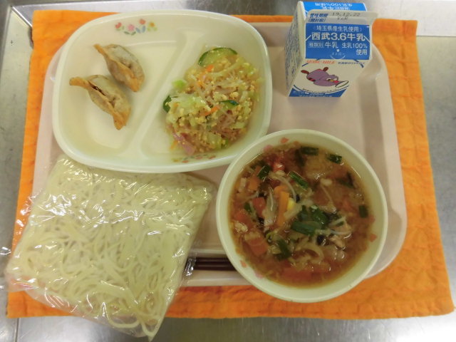 絵文字:食事 給食牛乳・ゴマ味噌ラーメン・春雨サラダ・揚げ餃子絵文字:食事 給食