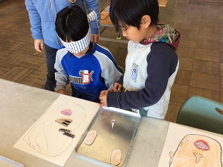 手ぬぐいで目隠しをして2人1組で行いました。