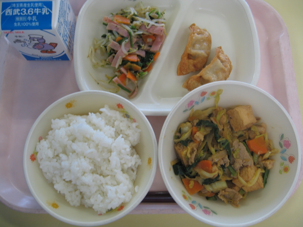 牛乳・ごはん・厚揚げのチャオサイ・モヤシのナムル・揚げ餃子