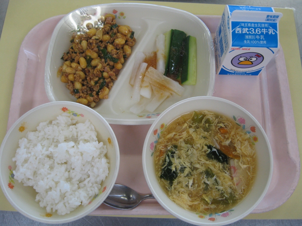 牛乳・ソイ丼・スティック野菜・かき玉汁