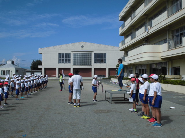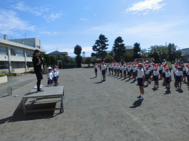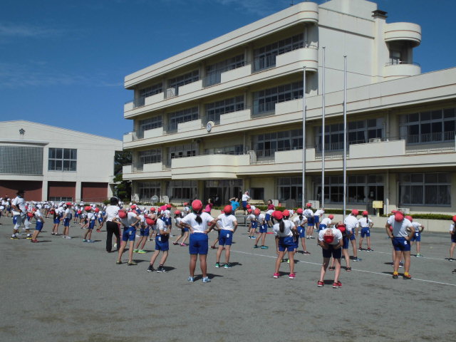 まず、特別支援補助員の長浜先生を全校児童に紹介しました。そのあと開閉会式の練習、ラジオ体操、大玉送りの練習をしました。子どもたちは先生方からの指導をしっかり受け入れ、大きな声と返事、素早い動作でとてもきびきびと動いていました。本番の運動会を楽しみにしていてください。