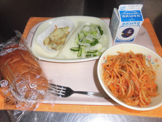 絵文字:食事 給食牛乳・黒パン・ポテトのチーズ焼き・温野菜・スパゲティナポリタン絵文字:食事 給食