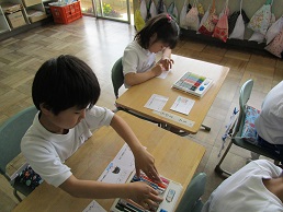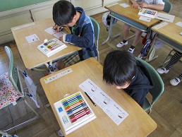 生活科では、学校について知る学習から始まります。学校のことを教えてくれる2年生に自己紹介用の名刺カードを書きました。みんな丁寧に字を書き、絵を描くことができました。