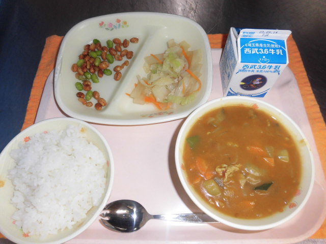 絵文字:食事 給食牛乳・夏野菜のカレーライス・お豆のカリカリ揚げ・大根サラダ絵文字:食事 給食