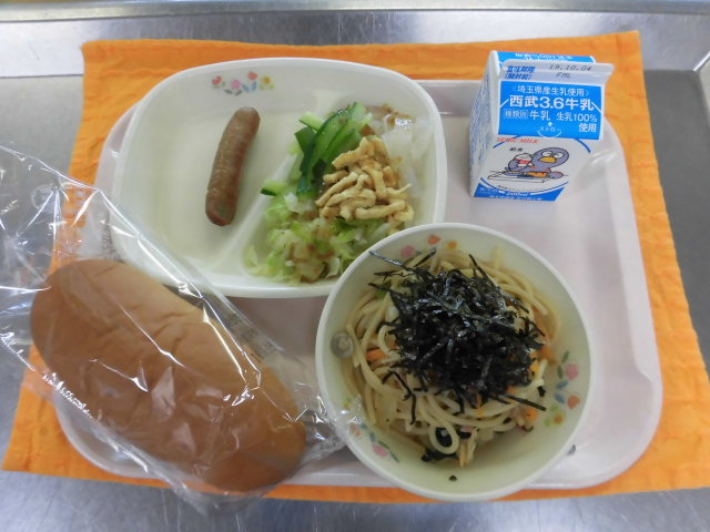 絵文字:食事 給食牛乳・森のきのこスパゲティ・パリパリサラダ・焼きフランク絵文字:食事 給食