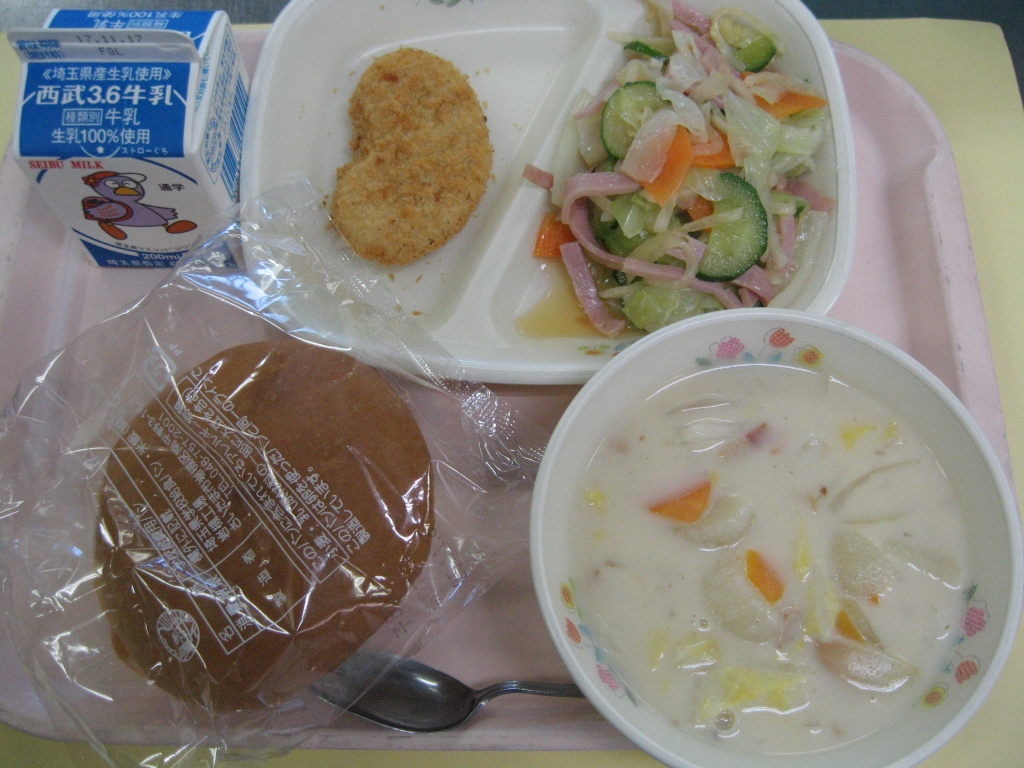牛乳・コロッケサンド・ハムと大根のサラダ・クラムチャウダー