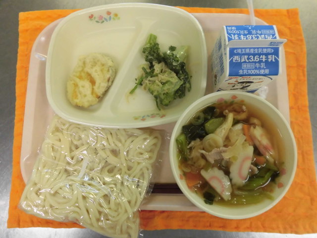 牛乳・肉うどん・サツマイモの天ぷら・冬野菜のゴママヨネーズ和え