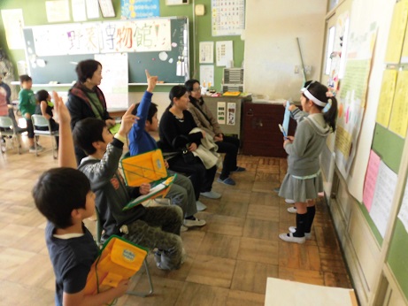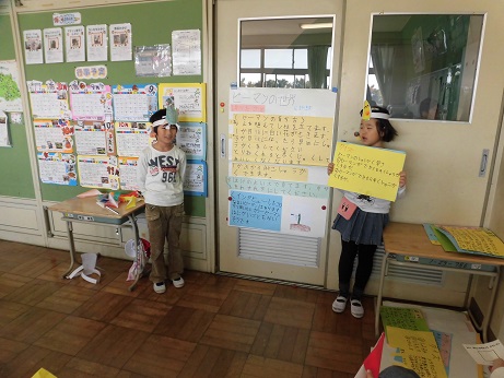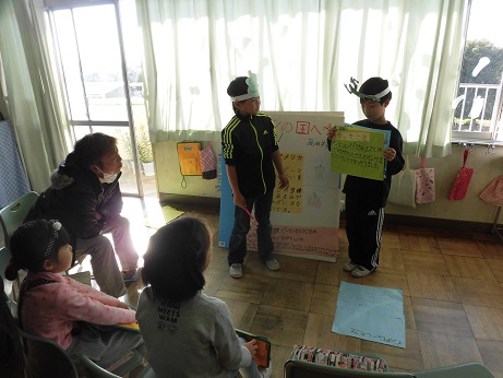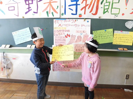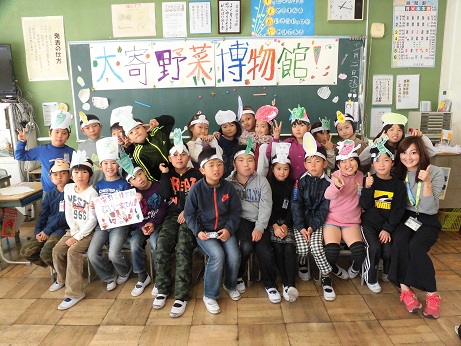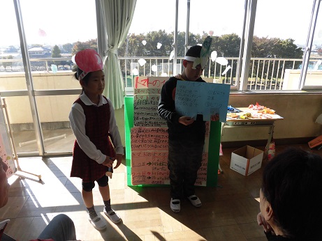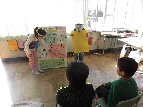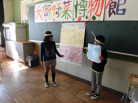 それぞれの野菜のお面をつけて発表しました。