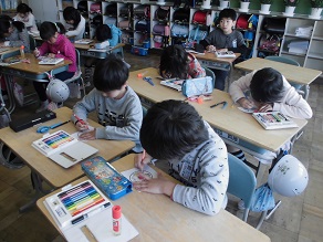 3年生が1年生を迎える会で1年生にプレゼントするメダルを作っていました。明日の1年生を迎える会で1年生に喜んでもらえるよう、ていねいに、きれいに一人一人が作成していました。