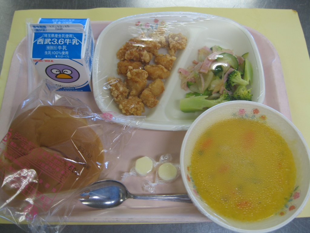 牛乳・フラワーロールパン・フライドチキン・ブロッコリーサラダ・豆乳パンプキンスープ・チーズで鉄分