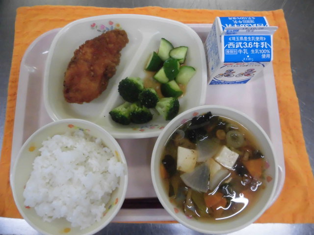 絵文字:食事 給食牛乳・ごはん・カレー風味カツ丼・ブロッコリーときゅうりのドレッシング和え・なめこ汁絵文字:食事 給食
