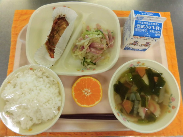 絵文字:食事 給食牛乳・ごはん・サバのネギ味噌焼き・たくわんサラダ・白玉雑煮・菊花みかん絵文字:食事 給食