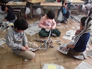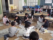 図工の学習と新聞紙を使って造形遊びをしました。新聞紙を丸めたり、つなげたり、重ねたりしながら新聞紙の特性を知りました。中でも、新聞紙は切る方向で長く切れたり、短く切れたりすることを子どもたちは体全体を使って実感していま