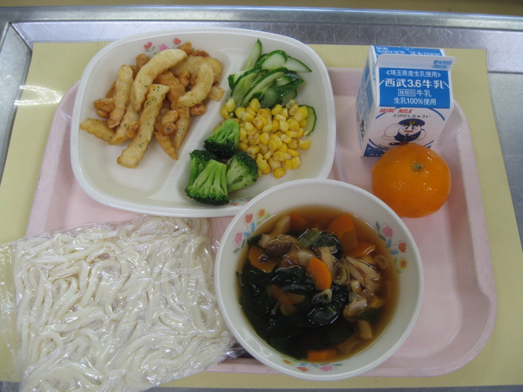 ◎牛乳・五目うどん・大豆とポテトの揚げ煮・サラダ・冷凍みかん