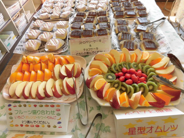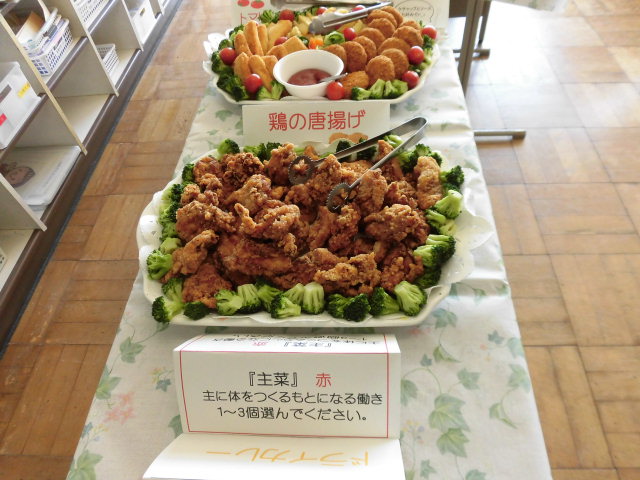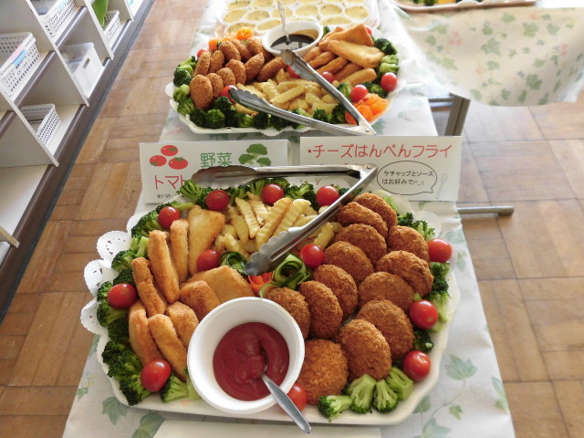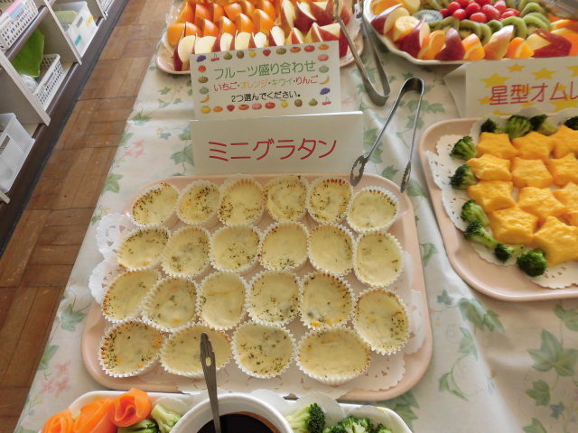 きゅうりや人参のお花の飾りに気づいてくれた女の子や普段とは違う料理に多くの6年生がとても喜んでくれました。サクサクの揚げ物、色とりどりのフルーツ、ふわふわのケーキやオムレツ、どれも大満足のバイキング給食でした。