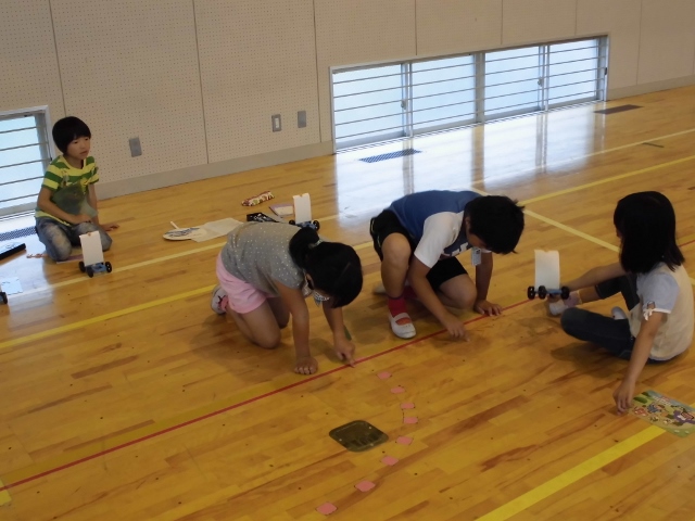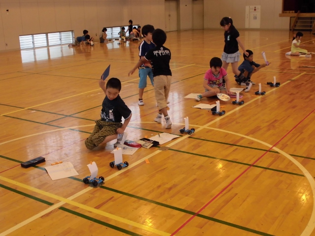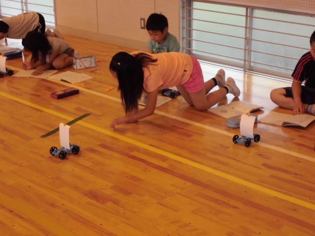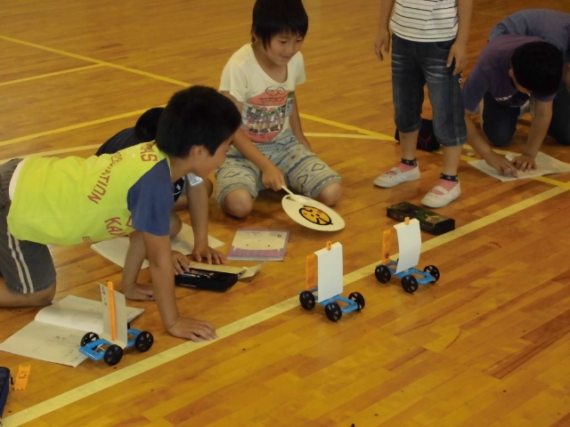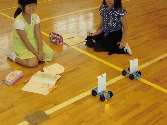 3年生が体育館で理科の授業をしていました。帆を立てた車に風をあて、どれくらい動くかの勉強でした。子どもたちは、風の当て方を工夫しながら何度も挑戦し、どんな風の当て方がよいか探していました。