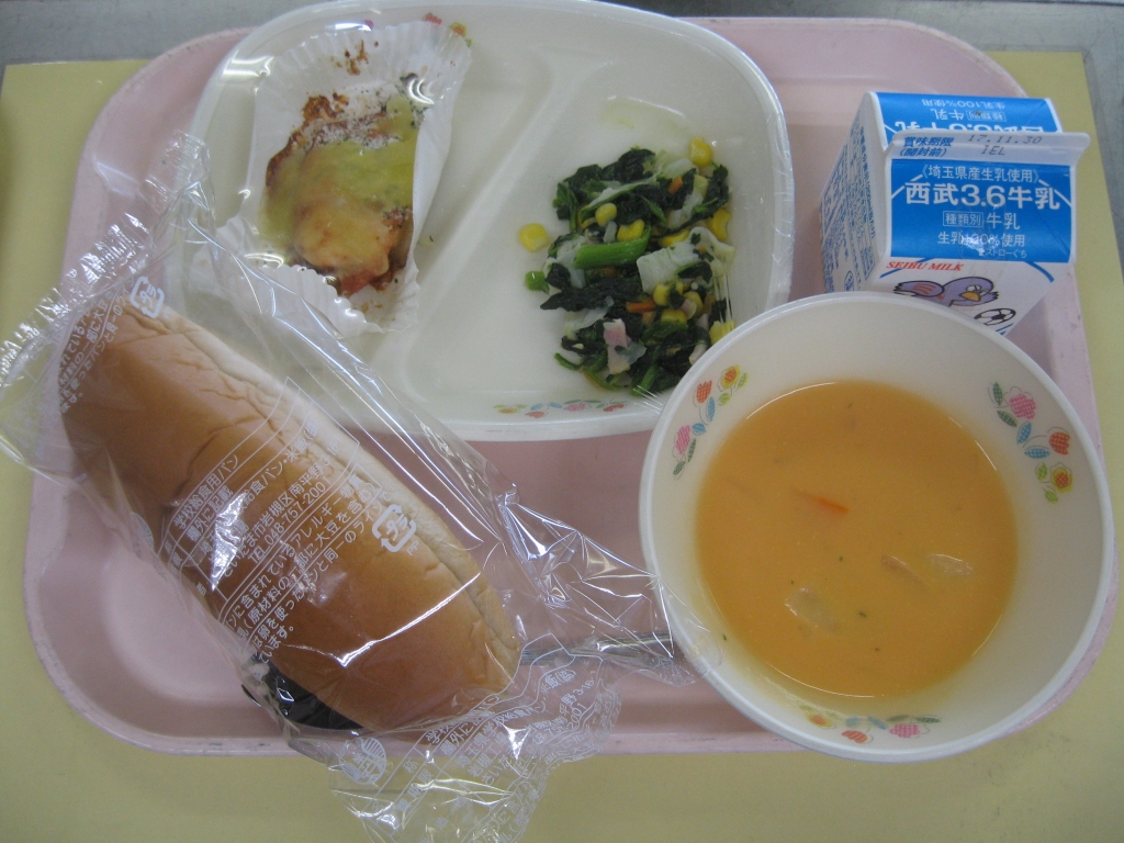 人参がたっぷり入ったキャロットスープです。豆乳とシチューの素で食べやすくつくっています。チキンの香味焼きは、ニンニクとオリーブオイル、塩コショウ、しょうゆで下味えおつけて焼きます。チーズとパン粉もかかっていて、子ども達が好きなメニューの一つです。