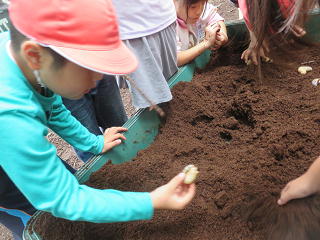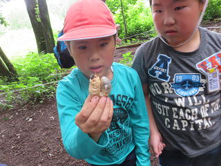 カブトムシの幼虫を自分で探し、手に取り、おす・めすの