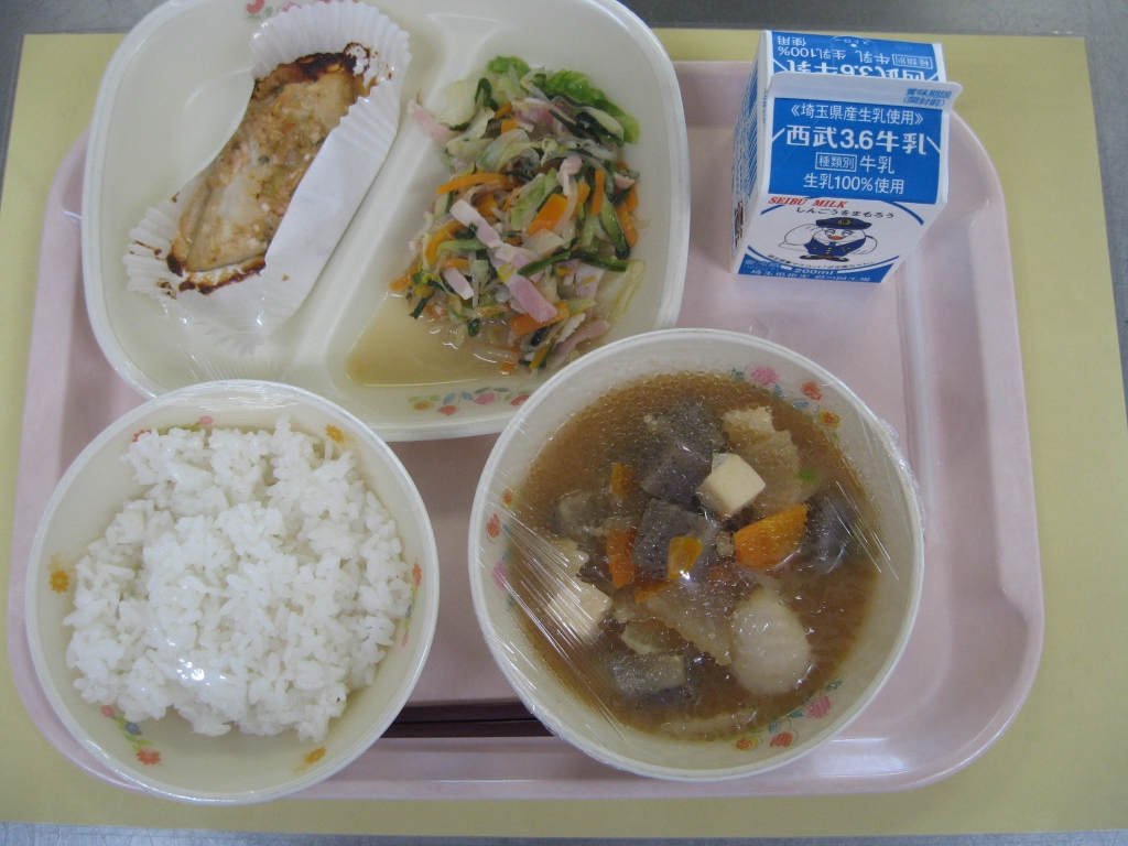 牛乳・ごはん・サワラのネギマヨポン焼き・野菜炒め・味噌けんちん汁