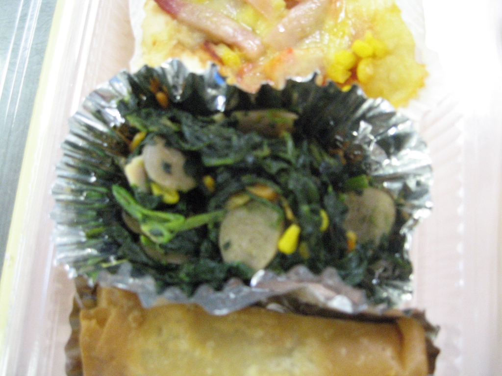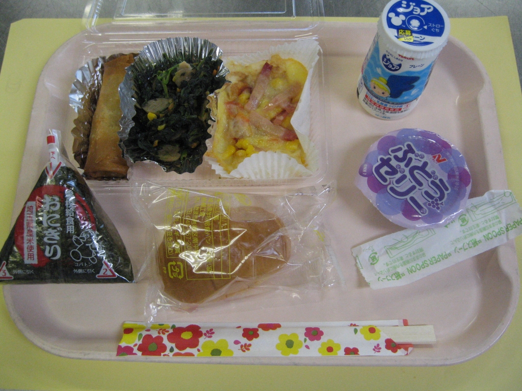 ジョア・おにぎり・バターロール・ピザ・春巻き・ほうれん草のソテー・ぶどうゼリー