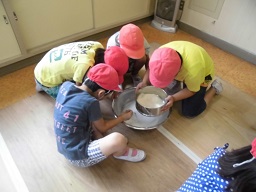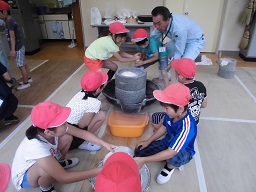 石臼体験は力一杯、回してお米を米粉にしました。