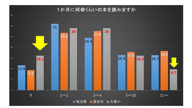 次に、校長よりにじいろ読書月間にむけてのお話がありました。どれくらいの本を読んでいるか調べてみました。全部の学年ではありませんが、大寄小はゼロ冊が16%、深谷市9%、県11%で読まない人の割合は多いです。また、11冊以上をみるとたくさん読む人も少ない傾向です。