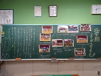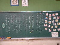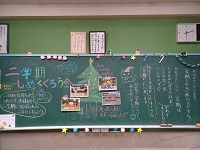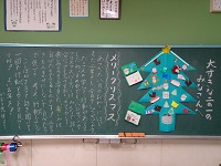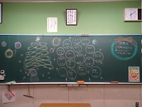 24日(水)は、クリスマスイブですが、深谷市内も含めて多くの学校が2学期の最終日でもあります。前日の教室には、担任の先生が描いた黒板アートが子どもたちを迎えるのを待っていました。