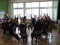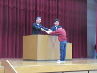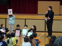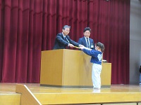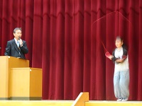 んばりと3学期の目標を読み上げました。校長先生からは、1人1人の「達成感」と「向上心」が光った2学期だったこと、短い冬休みにぜひ頭と体を動かしてほしいとのお言葉がありました。手軽にできる運動ということで、6年生の運動委員会の委員長さんたち3人にお手本になってもらい、なわとびの取り組み方を教えてくださいました。