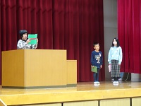 3人の表彰を行い、見事な校歌斉唱のあとに、1・4年生とけやき学級の代表児童が作文を読みました。それぞれが2学期のがんが校の皆さん、