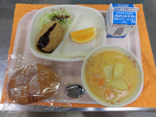 ★牛乳・メンチカツサンド・茹でキャベツ・豆乳キャロットスープ・オレンジ★