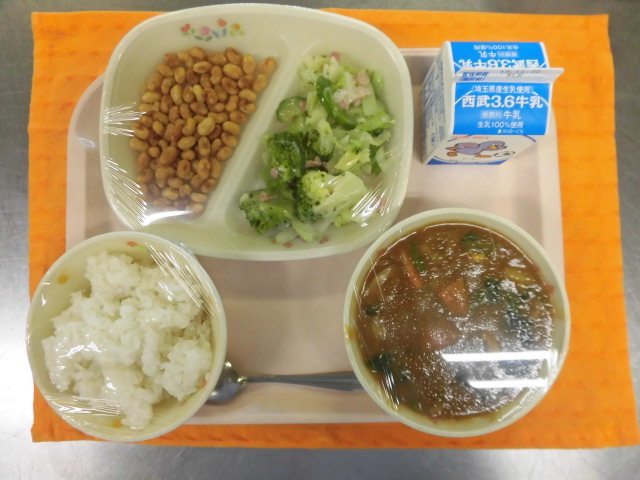 牛乳・冬野菜のカレーライス・大豆のカリカリ揚げ・シーザーサラダ