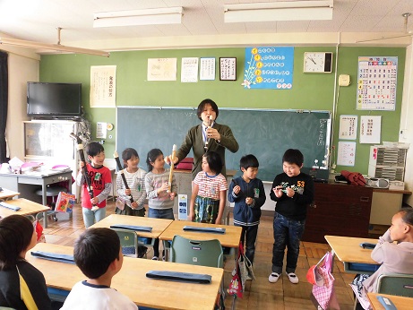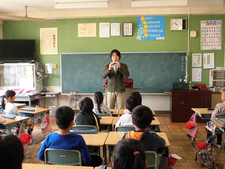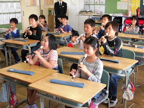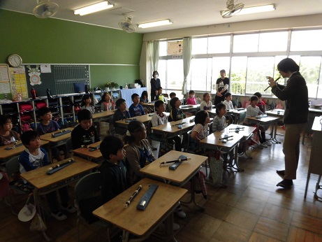学習をする前に、タニタ楽器の方に来ていただき、リコーダーの使い方、タンギング、息づかいについて教えていただきました。