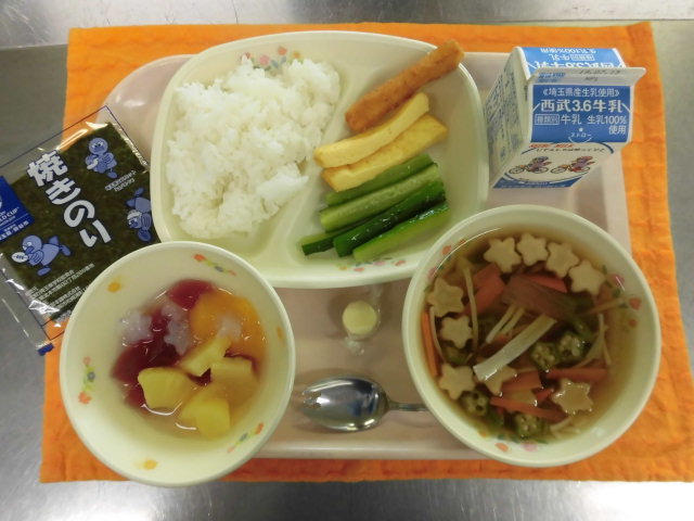 今日は七夕給食です。フルーツポンチや七夕スープにたくさんの星がありました。