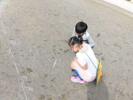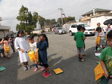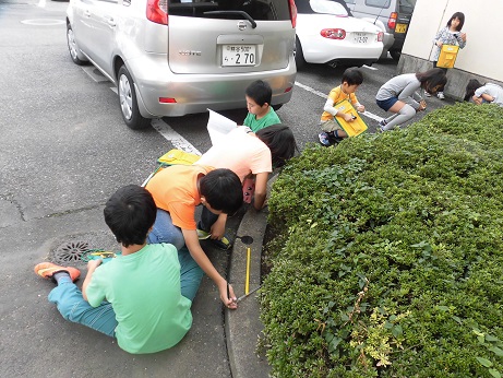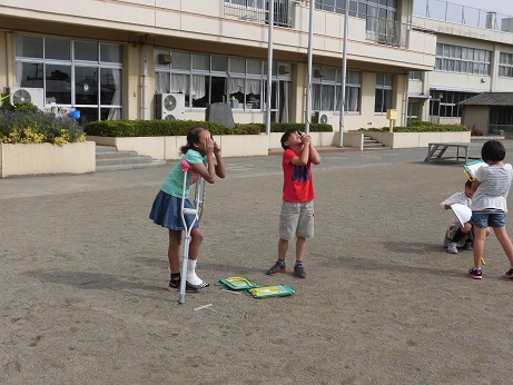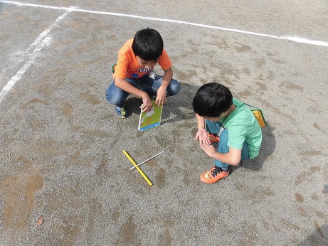 今日の理科の学習は「日なたと日かげの温度調べ」です。日の当たる場所を探して、温度を探しました。日かげは校舎の裏側で計りました。