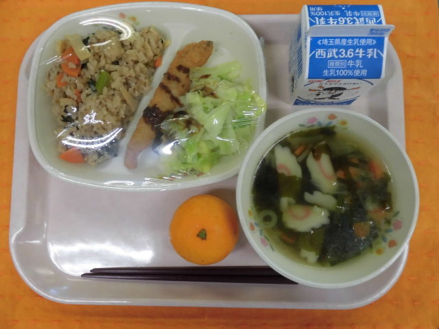 牛乳・中華風炊き込みごはん・ししゃもフライ・茹でキャベツ・わかめスープ・みかん