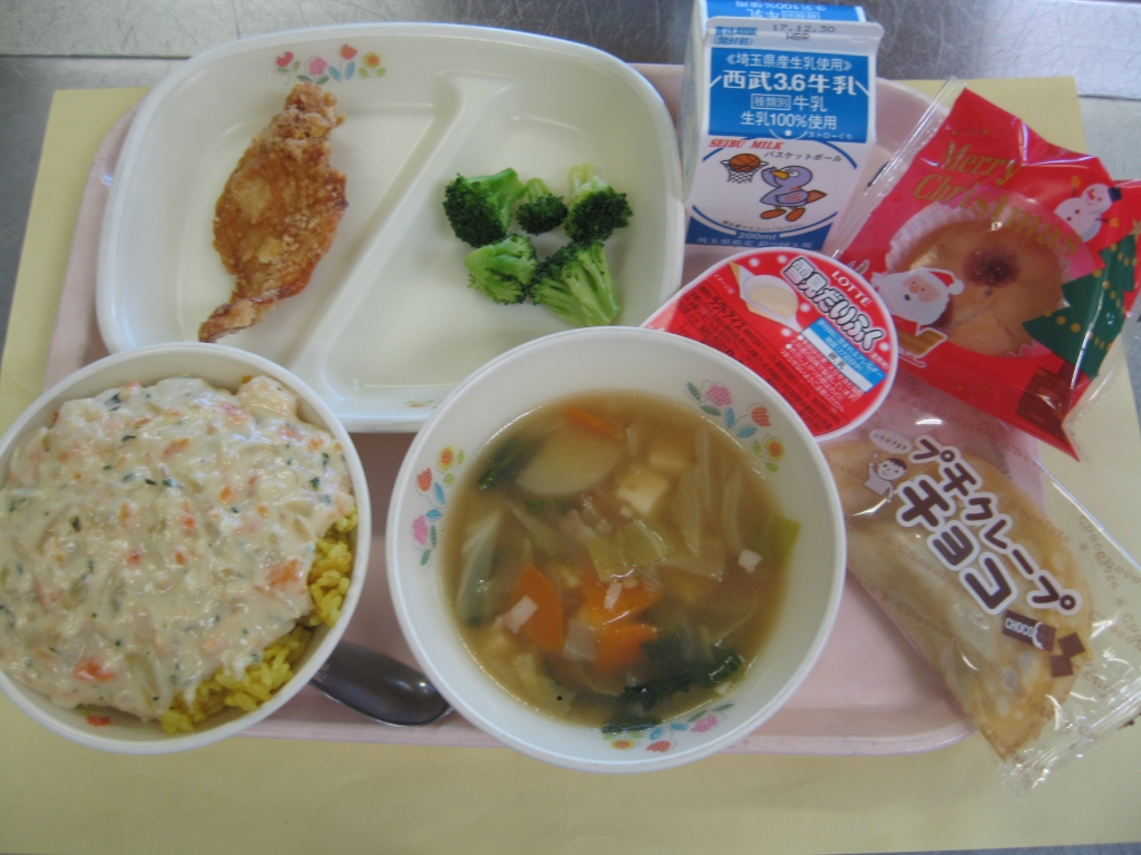 牛乳・カレーピラフドリア風・鶏肉のレモン煮・茹でブロッコリー・コンソメスープ・セレクトデザート