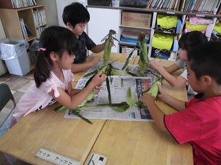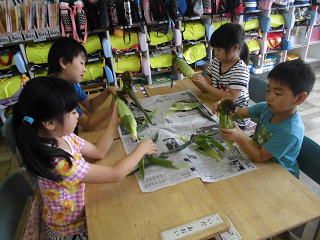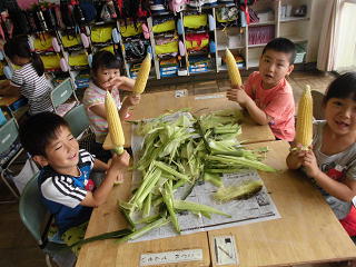 給食のお手伝いで、トウモロコシの皮をむきました。