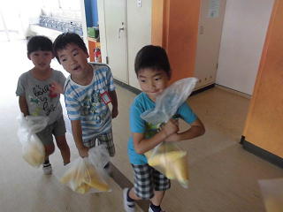 むき終わったトウモロコシを、給食室に届けました。
