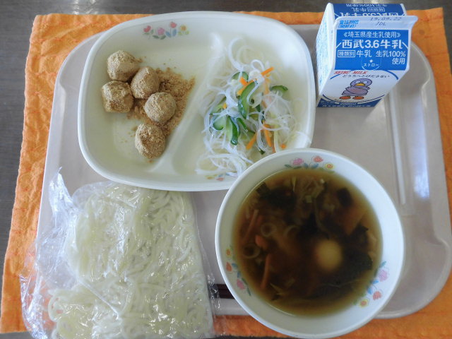 絵文字:食事 給食牛乳・醤油ラーメン・白玉団子のきな粉和え・春雨サラダ絵文字:食事 給食