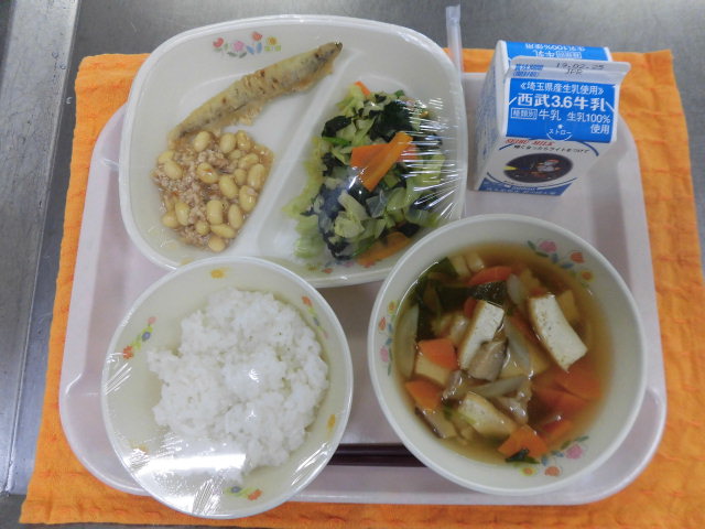 牛乳・ごはん・ししゃもフリッター・大豆の油味噌・からし和え・沢煮椀