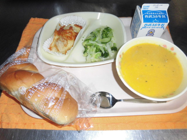絵文字:食事 給食牛乳・ツイストパン・ガーリックチキンソテー・グリーンサラダ・豆乳パンプキンスープ絵文字:食事 給食