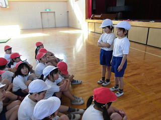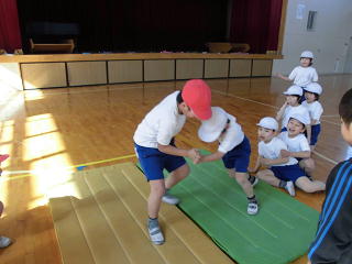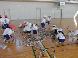 紅組と白組に別れ、豆(新聞紙の玉)を投げ合いました。
