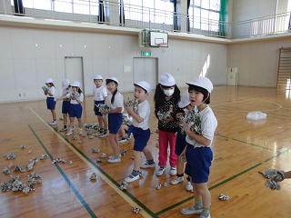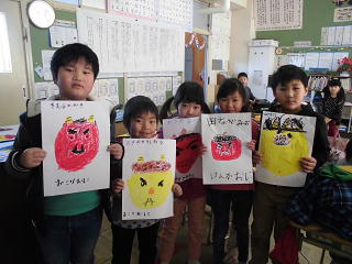 ということで、「心の仲の悪い鬼を退治しよう」と、まめまき集会をしました。
