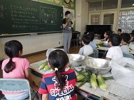 はじめに 栄養士の湯澤先生から,とうもろこしについてお話をしていただき、むき方を教わりました。