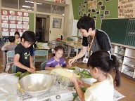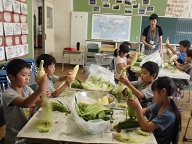 硬い皮から柔らかい皮になって、だんだん粒が見えてくると「でてきたあ。」と歓声が上がりました。1人 2、3本をていねいにむいて、給食室の調理員さんに届けました。