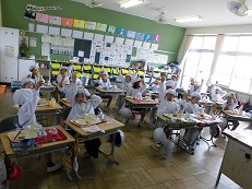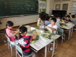 給食の時間、自分たちでむいたとうもろこしが登場しました。とってもおいしくて「もっと食べたいな。」という声が聞こえました。また、とうもろこしが苦手な子も最後までがんばって食べていました。