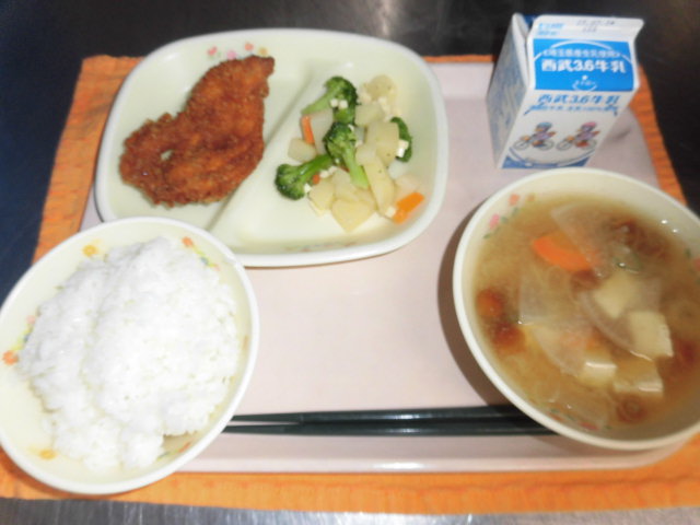 絵文字:食事 給食牛乳・カレー風味カツ丼・ポテトのさっぱりサラダ・なめこ汁絵文字:食事 給食